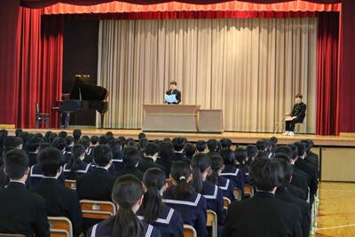 3学期修了式を行いました 投稿: 管理者1 (08:46) 3月26日、3学期の修了式を行いました。 1・2年生の代表者から「1年間を振り返って」を発表してもらいました。 生徒の皆さんも是非この1年間を振り返って見てください。 そして有意義な春休みを過ごしてください。 4月7日は新3年生の準備登校、4月8日が始業式です。 Tweet -