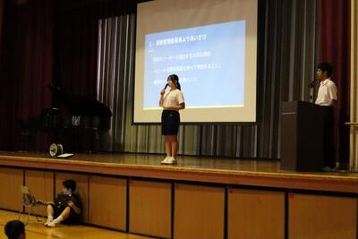 式では1年生、2年生、3年生の代表生徒が「1学期を振り返って」を堂々と発表してくれました。