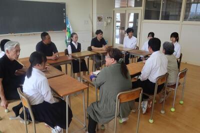 本校の生徒会本部役員7人と学校運営協議会の方々による熟議を行いました。